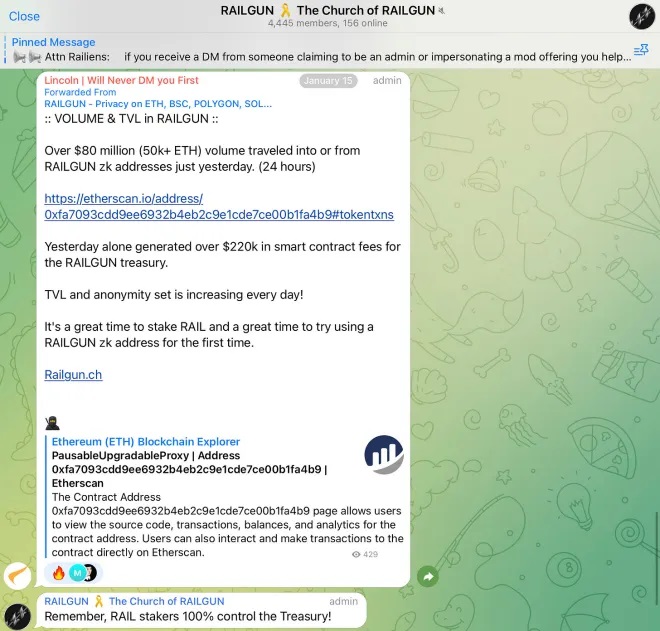 The Railgun team were celebrating this influx of funds several times and even put it out on their announcement-only channel. Railgun stakers, the biggest of which being Edward Fricker who runs the project, will now be directly profiting off the movement of illicit funds.