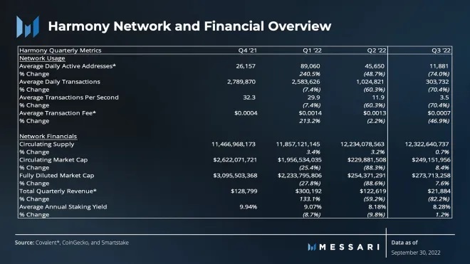 Harmony $ONE network usage and overall financial performance also declined for the second quarter, this quarter’s decline was catalyzed by the Horizon Bridge hack that occurred on June 23, 2022. This incident resulted in the bridge being drained of $100 million in assets from the Ethereum and BNB chains. This breach only exacerbated the decrease in network activity following Defikingdoms decision to launch on an Avalanche subnet in Q2.