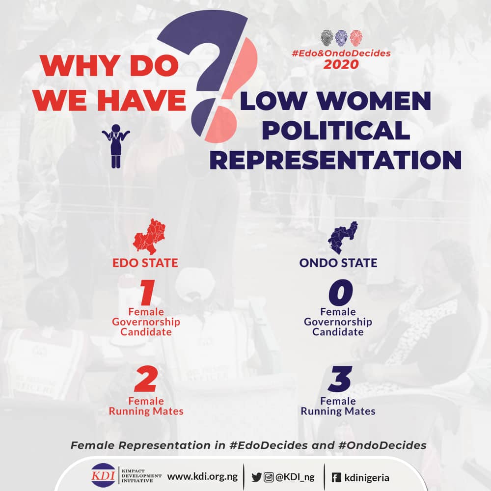 A Report has queried the low participation of women as gubernatorial candidates in the forthcoming governorship elections in Edo and Ondo States. Released by a non-governmental organisation, Kimpact Development Initiative, and titled Why do we have Low Women Political Participation, the report had a breakdown of the gender, age and qualifications of the candidates in the two forthcoming elections.