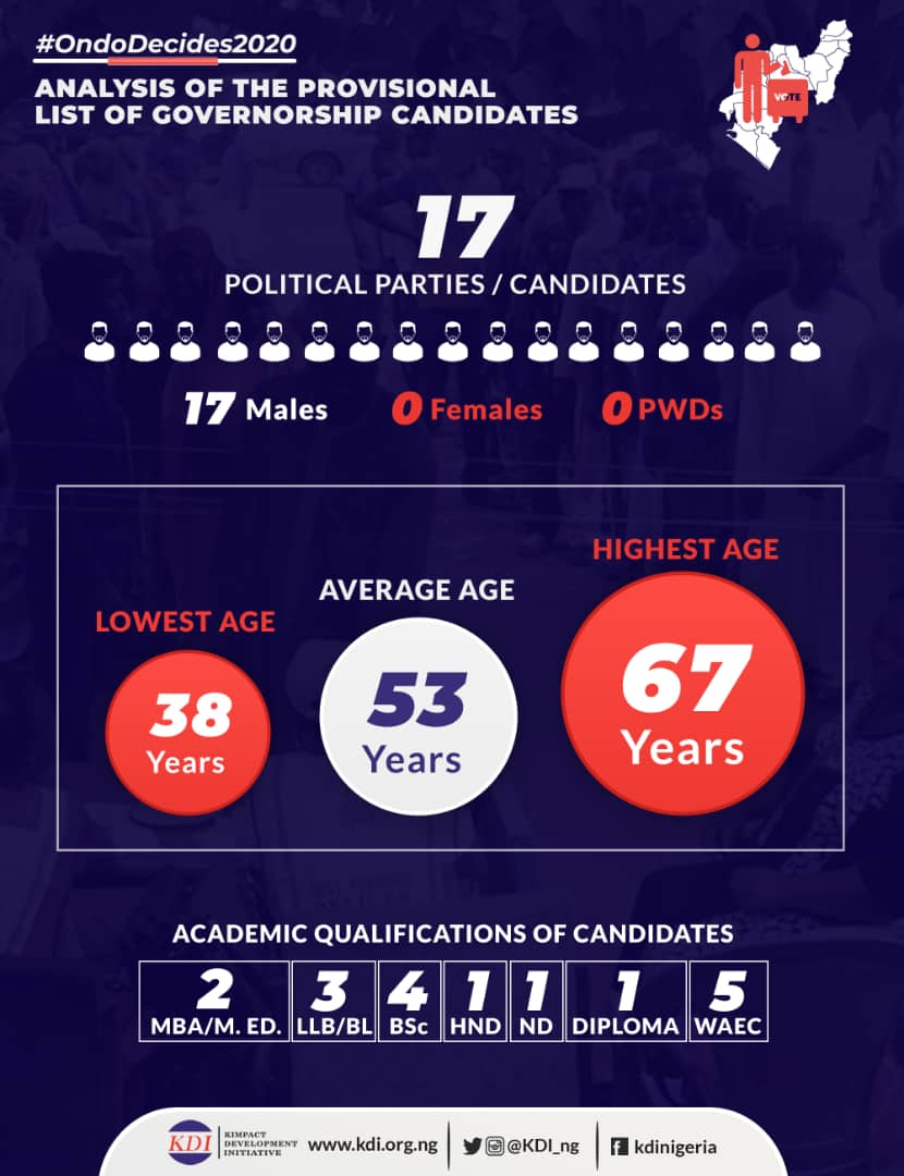 In Ondo State, insights from the report also recorded a worse dimension as there was no female governorship contestant while three of the female contestants that reflected among the 17 contenders for the governorship seat were running mates. In the state, analysis of the candidates’ qualifications breakdown indicates 5 candidates are WASSCE holders followed by 4 Bachelor’s degree holders while diploma, National Diploma and Higher National Diploma recorded 1 candidate each.