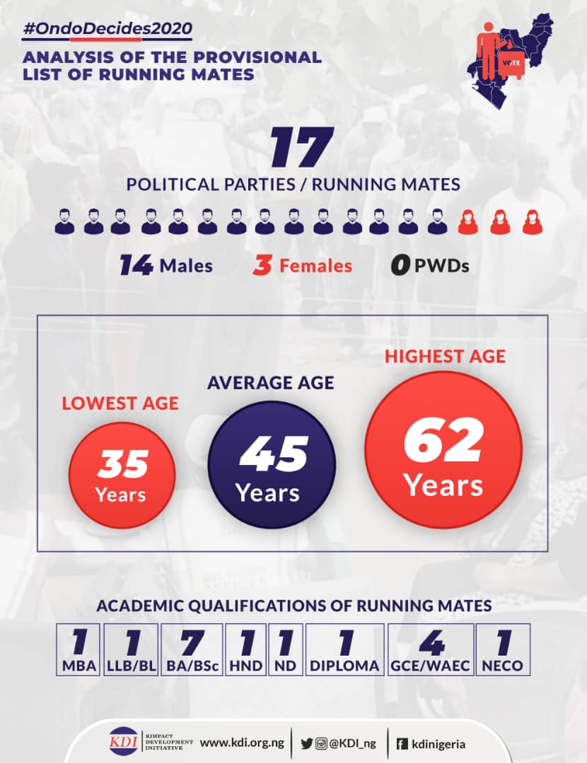 For running mates, the candidates’ qualifications records showed 8 candidates with Bachelor’s Degree, 5 candidates with West African Senior School Certificate, while 3 candidates hold Diploma, National Diploma and Higher National Diploma, respectively.