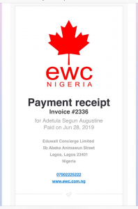 The story of Adetula Segun Augustine is not quite different from the 22 students. In 2019, in his efforts of seeking further education in Canada, he approached Eduwalt Concierge at its Ibadan branch for the facilitation of his movement to Canada. The company collected N200,000 as professional fees, which was paid immediately into the company’s account details. For more than four months, the company repeatedly notified him that his admission has not been successful.