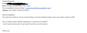 Me: It has been more than 5 days that I sent an email to your contact centre over the inability to use transaction code on my accounts.