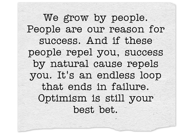 We grow by people. People are our reason for success. And if these people repel you, success by natural cause repels you. It’s an endless loop that ends in failure. Optimism is still your best bet.