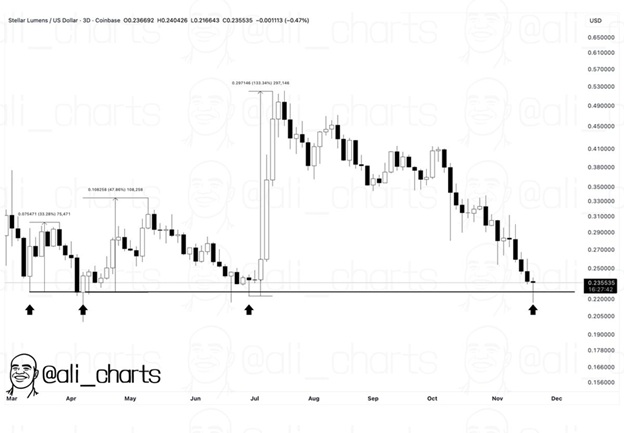 Analyst Ali Martinez noted that XLM has reacted strongly each time it touched the $0.23 zone in 2024. During earlier visits to this level, the token climbed 33% in March, 48% in April, and 133% in July. With the price now back in the same area, traders are comparing the current structure with those earlier rebounds.