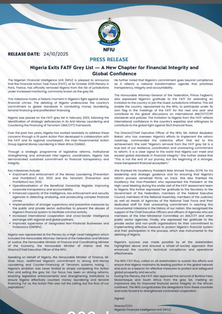 Earlier this year, NFIU Chief Executive Officer Hafsat Bakari had projected that Nigeria could exit the list by late 2025, following the approval of the country’s fifth progress report by the FATF. The report, she said, reflected “Nigeria’s concrete and measurable progress in strengthening its AML/CFT framework.”