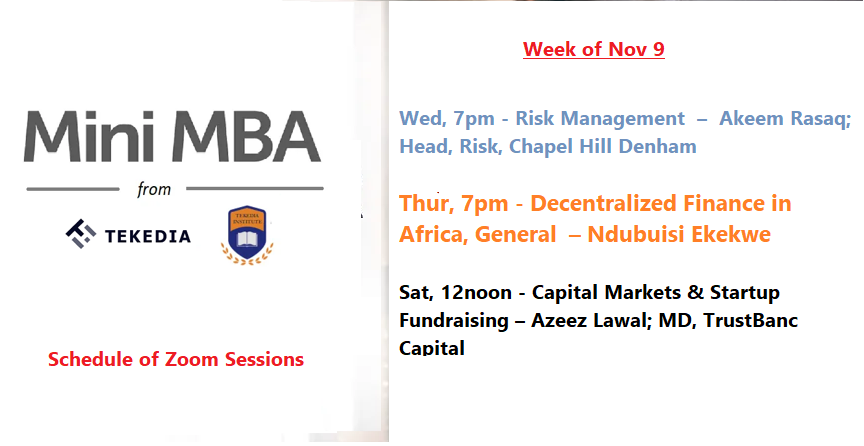 This is the schedule for this week’s Tekedia Mini-MBA Live zoom sessions. We will have three Faculty members; zoom links in the Board.