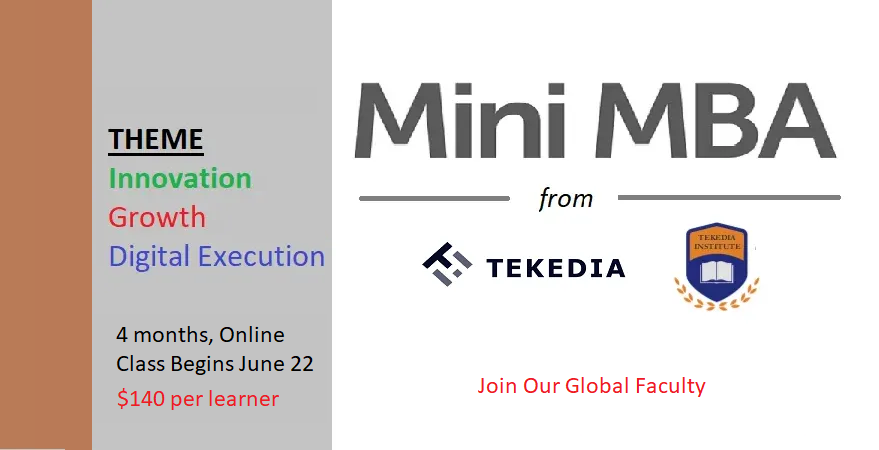 Invent, innovate and drive organizational transformation, performance, and growth. Capture emerging opportunities in changing markets while optimizing innovation and profitability. Digitally evolve your business or functional area, turning digital disruption into a competitive advantage. Master the concepts of building category-king companies, and thrive. Tekedia Institute offers an innovation management 4-month program, optimized for business execution and growth, with digital operational overlay.  Classes begin June 22, 2020, online. Click & Register Today.