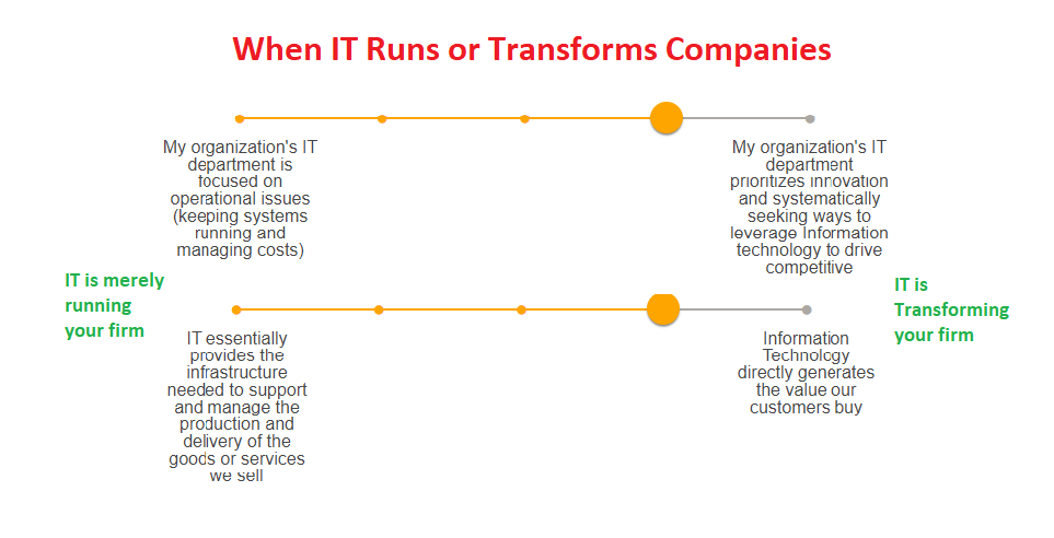Look at your company, and answer the questions. Understand that IT is not just having servers and computers but using data analytics, software tools to stimulate demand and drive sales, etc.