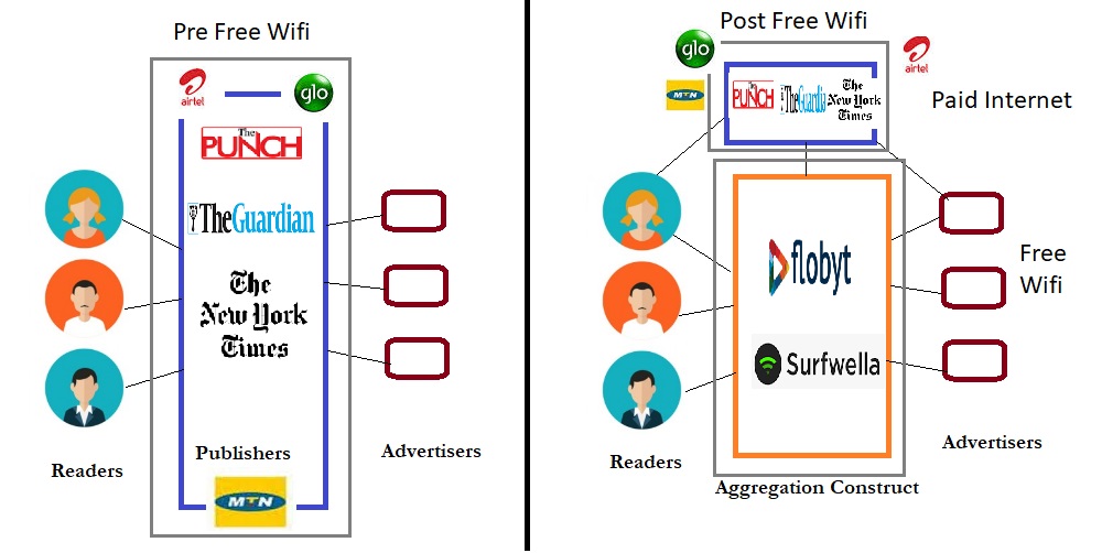This is exciting for the end users because getting internet free in Nigeria is certainly empowering. The providers are working on the established constructs that scale, through freemium, can deliver huge value down the line. You give the Wifi service free and in that system become an aggregator who controls the ecosystem through which the end users and the publishers get in contact. This is the aggregation construct.
