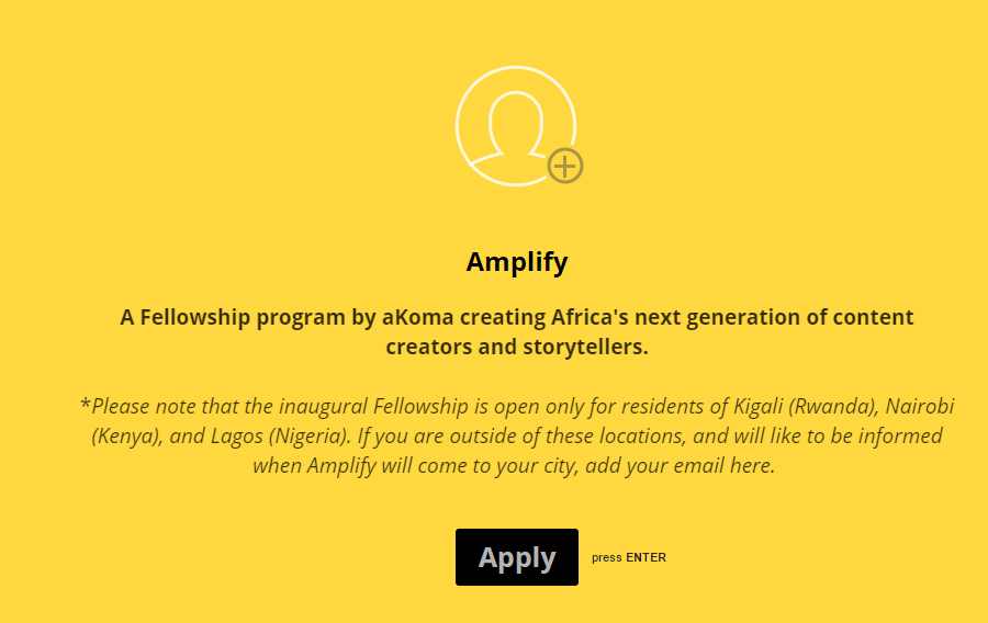 Amplify is running a program. It is a paid Fellowship program for talented African storytellers and creators. Amplify is a partnership between aKoma and MasterCard Foundation.