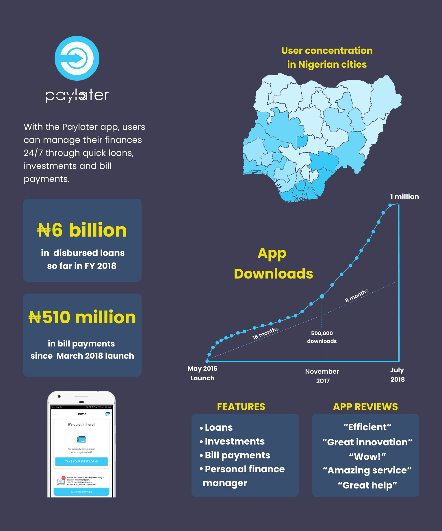 The evidence is in the numbers. With over 800,000 registered users, across every Nigerian state, Paylater has loaned over $17M USD to Nigerian consumers in 2018 so far. The technology platform has supplemented that loan growth with very strong early adoption of its bill payments and investments features as well.