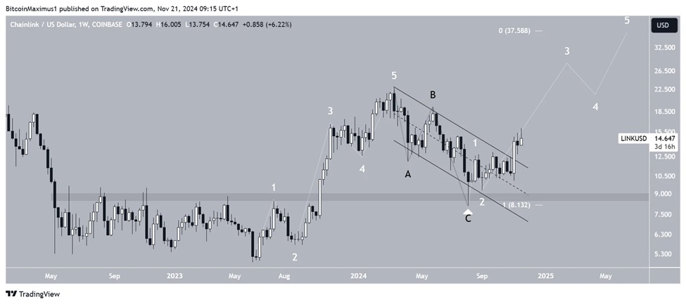 Chainlink’s LINK hasn’t performed as well as its peers, gaining 40% this month and a mere 15% overall this year. However, it recently broke from a descending parallel channel that it has traded in for days, indicating the potential for a bull run.