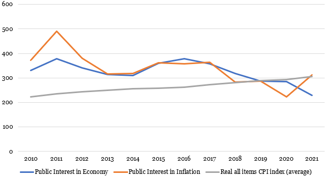 Exhibit 2: Public interest versus real all items CPI index between 2010 and 2021