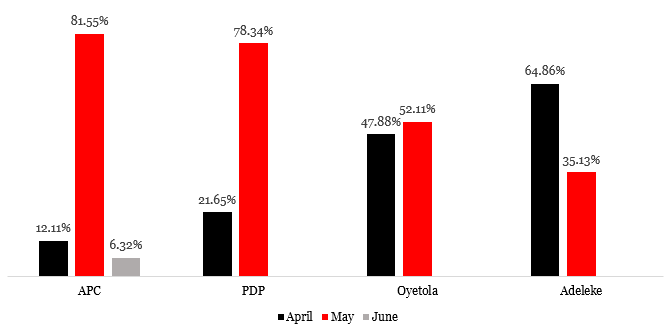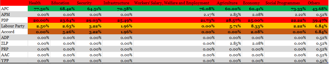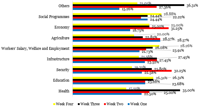 According to the findings, issues are owned differently by different parties. Throughout the four weeks, the ruling party (APC) concentrated on performance issues, with particular attention paid to the health sector, worker salaries, welfare and employment, social programs, and infrastructure. The PDP, the main opposition party, addressed concerns of reputation (personality assaults, party attacks), security, and agriculture. After the PDP, Accord was determined to be equally responsible for addressing reputational issues. The party (Accord) also engaged the public by discussing concerns and/or needs related to education and security. Like the PDP, Labour party was also discovered to owned economy, reputational issues of the members and candidate of the ruling party as well as agriculture and found them worthy of discussing.