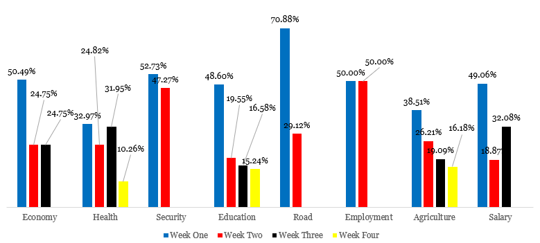 Our analyst and his colleagues noticed a glaring mismatch between what interested the public and what the political parties owned and disseminated to them (Osun public) during the monitoring period. In week one, people were interested in learning about road conditions, which falls under the infrastructure category, and the economy, according to the analysis, but political parties primarily highlighted agriculture and social programmes. People were concerned about work and security in the second week. During the week’s assessment of this, as well as the parties’ personal difficulties, a mismatch was noticed (see Exhibit 3) and in week four. When discussing and seeking information regarding salary and health, the parties and the public only aligned during week three of the campaign activities.