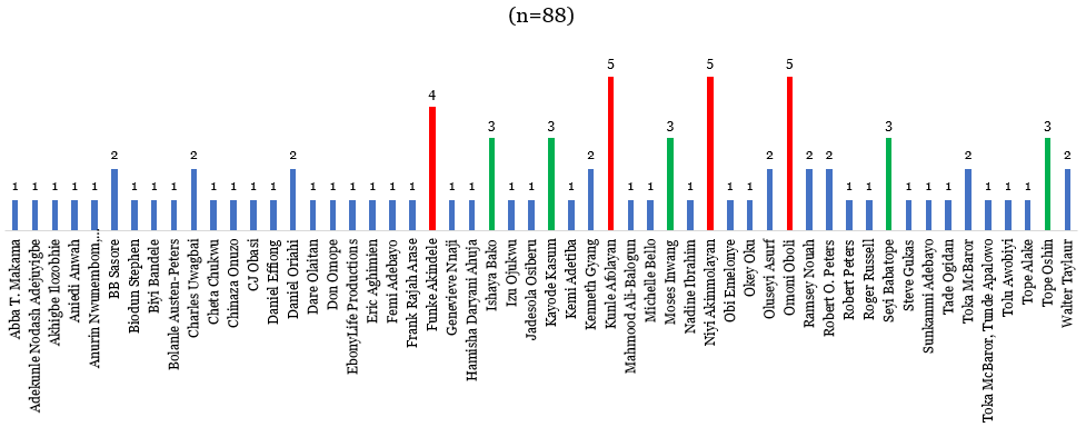 Exhibit 1 illustrates the distribution of selected Nollywood movies on Netflix, highlighting their producers and directors. Names like Moses Inwang, Niyi Akinmolayan, and Oluseyi Obid emerge as dominant figures, with five movies each on the platform. Meanwhile, several others, including Funke Akindele and Kunle Afolayan, hold a smaller but significant presence. This uneven distribution raises critical questions about how content is selected and whose stories are amplified in the global arena.