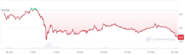 Polkadot (DOT) has encountered major difficulties this month, suffering a considerable drop of 30%, which has reduced its present price to $4.3. This reduction has led to an overall market cap of around $6.8 billion. The decline in value suggests a decrease in investor interest, especially as network activity has exhibited signs of a slowdown in recent weeks. In just the past week, DOT has experienced another drop of 7%, which has led to its poor performance compared to rival cryptocurrencies like Ethereum.