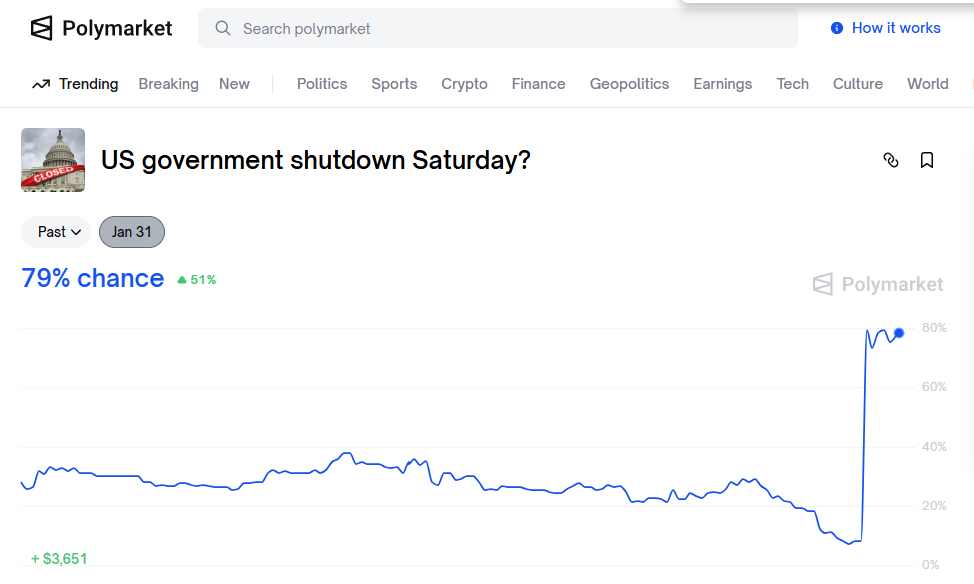 The odds of another US government shutdown occurring by January 31, 2026, have surged on Polymarket, currently standing at 81% for “Yes” on that outcome.