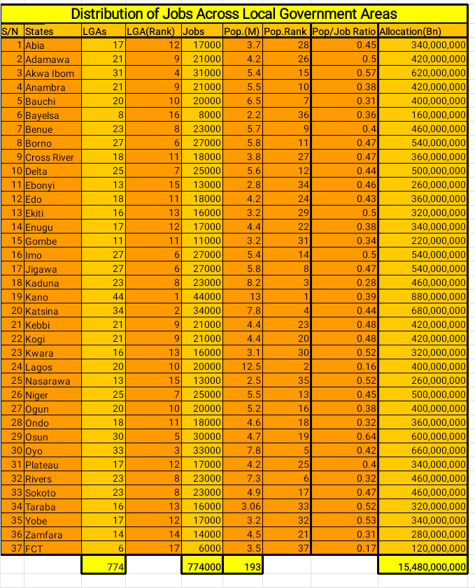 No doubt population size would have been the best determining factor for the distribution of the 774,000 jobs. Say, for every hundred thousand people, a state should get a thousand jobs. It’s not too late to include this factor as the state selection committees are still in the process of selection.