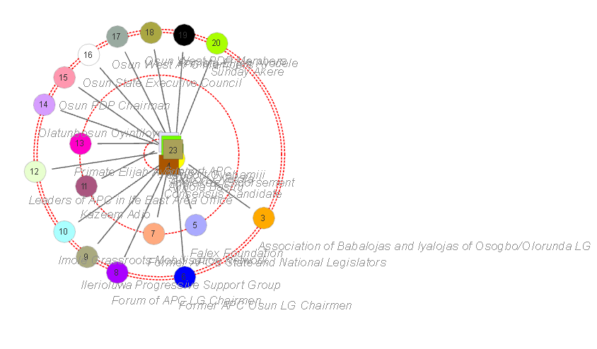 On the other side of the aisle, former governor Gboyega Oyetola remains a dominant figure. The data shows that support for Oyetola is the single most powerful force within the All Progressives Congress (APC) ecosystem [represented by node 23 in exhibit 2]. His political machine, built over years in office and sustained through loyal structures like the Ilerioluwa Progressives and various APC local groups, remains firmly intact.