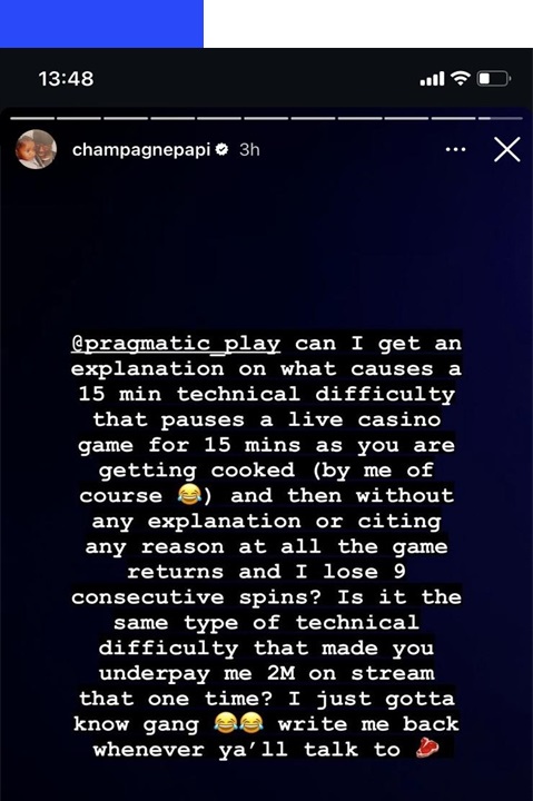 Drake recently posted an instagram story where he tagged the live casino game provider Pragmatic Play… for all the wrong reasons. Read on to find out more.