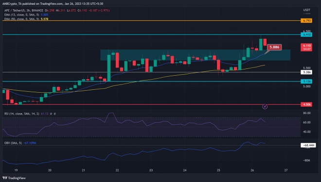 ApeCoin [$APE], the in-house token created to power Yugalabs’ ecosystem for the ApeDao community, has been oscillating between $5.386 and $6.000 range since 22nd of January. But it broke above the range and reached a 24 hours ATH of $6.410 after BTC surged to $23.8K.