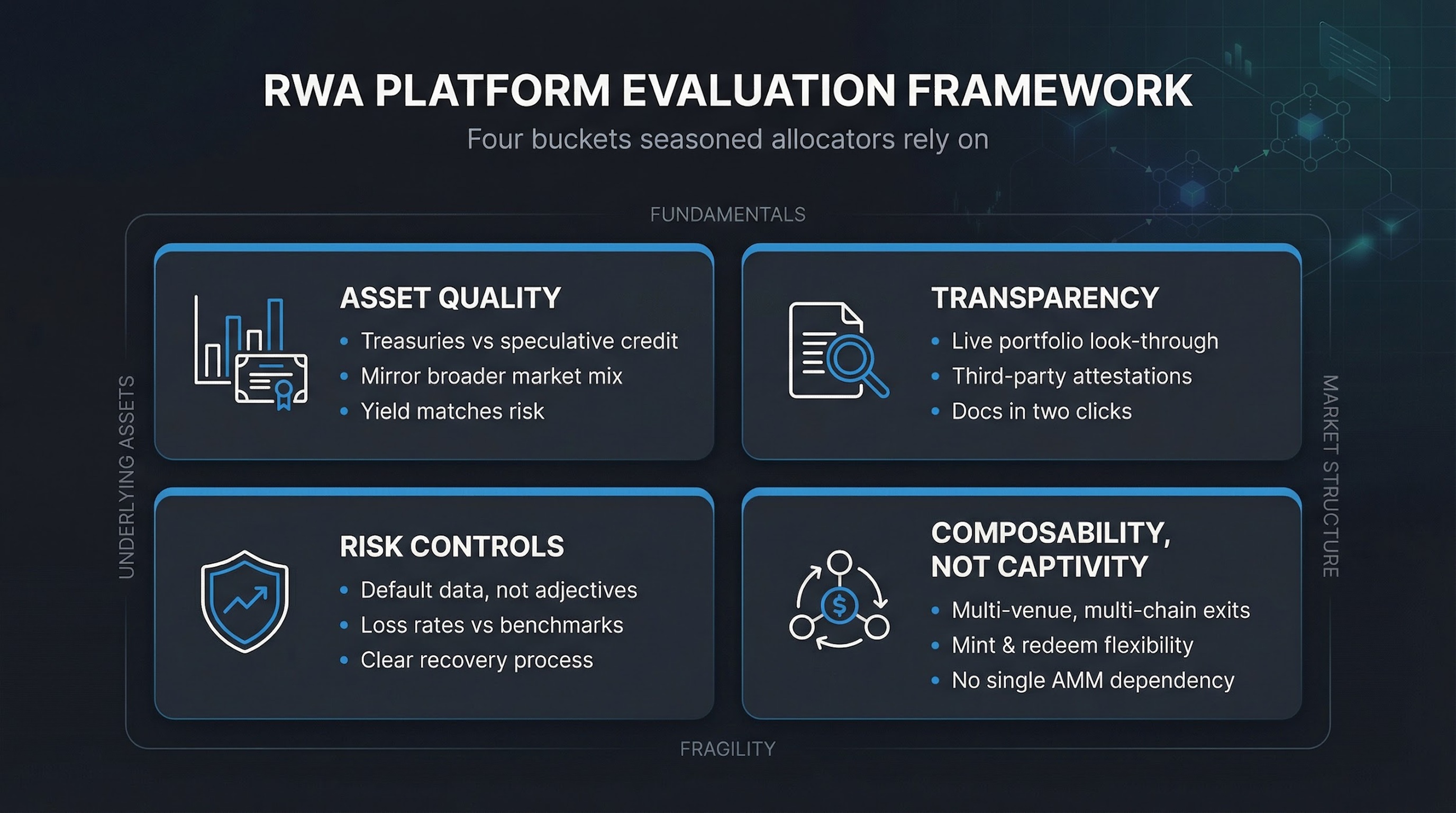 A four-part framework allocators can use to evaluate real-world asset tokenization platforms beyond the marketing deck.
