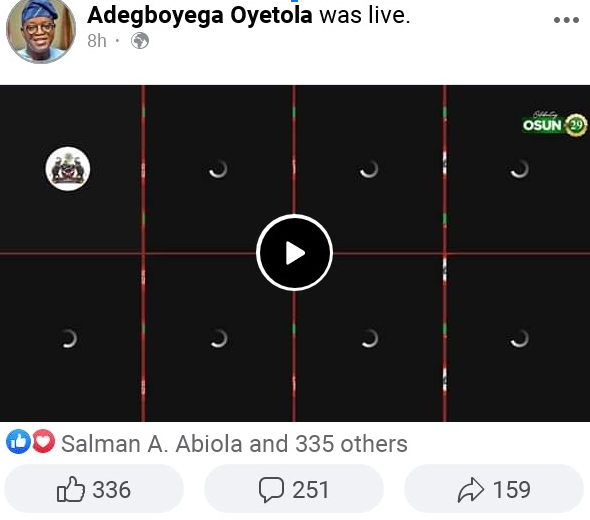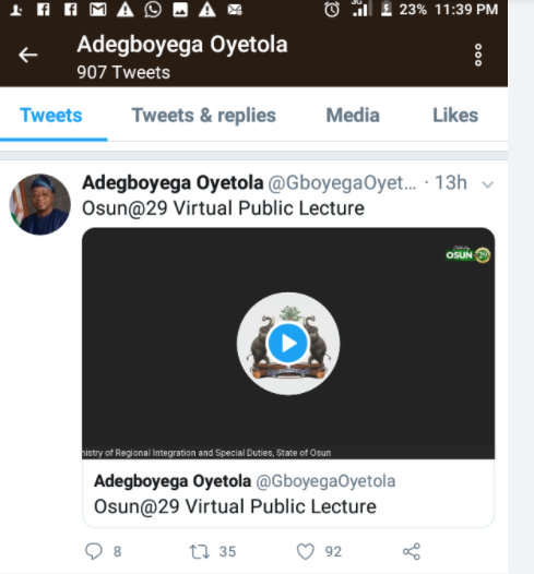 My background checks (pictures attached) revealed that on Twitter, the Governor’s handle (or perhaps one of) had less than 10 comments when the video of the lecture was posted. Less than 10 comments in over 8 hours of the post? No engagement! Two, the Government of Osun handle was updated in the last 5 days! Who are the handlers? Are they promoting the government for free? No engagement! Three, the Facebook video on the Governor’s page generated a number of comments unlike what was observed on Twitter.