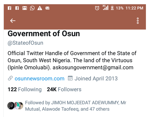Sogo Omo Osun: The handle has been existing since 2013 and all the handle can get is just 24k followers? If 90% of the followers of the handle are from Osun, statistically the patronage would be more than this, don’t forget, proximity is a key factor to be considered in a news story, trust me whoever that is not from Osun will not react or retweet, because they share no interest in the happenings in the state, I hope you can understand me.