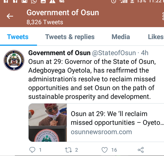 Sogo Omo Osun: I am happy to inform you that what is indigenous can never be digitalized within a twinkle of an eye. We do more than engaging, we act when necessary, but funny enough, many don’t even patronize the app. If I may ask, don’t you have an Instagram handle? Do you stay on the app like others, so, why did you open the app? The same response you give will answer your question of why twitter handle was registered for Mr governor..