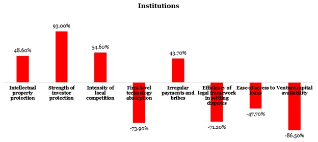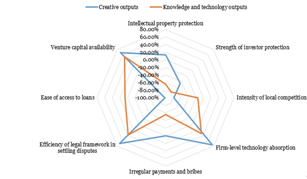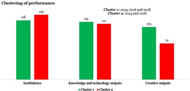 When we break down the years, it becomes apparent that institutions performed better in 2018 compared to other years between 2013 and 2022, particularly in contrast to 2013 and 2014. Although 2013 wasn’t a favourable year for the country in terms of institutional ranking, it was relatively successful in terms of innovation outputs, especially in the realm of creativity. On the other hand, 2014 exhibited slight improvements, particularly in knowledge and technology output.