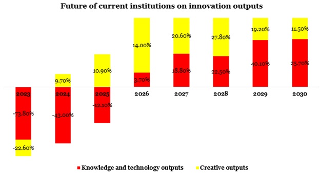 In the future, the current status of institutions will be bleak on attaining innovation outputs, at least between 2023 and 2025. During this period, Nigeria is expected to feel the significant effects of political, regulatory, and business environments on knowledge, technology, and creative outputs. However, there is optimism for more positive outcomes from 2026 to 2030. To mitigate the adverse effects of these institutions on innovation outputs and to enhance future results from 2026 to 2030, political and business leaders must address inherent challenges within the political, regulatory, and business environments. Political leaders at all levels, from federal to state and local, should create a conducive environment that facilitates the effectiveness of legal frameworks aimed at resolving various disputes related to intellectual property.
