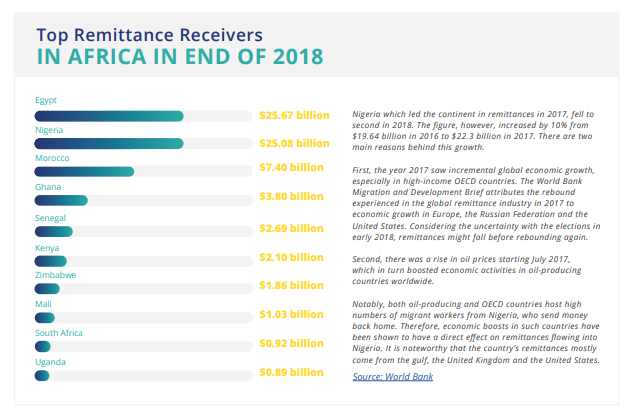 Nigeria which led the continent in remittances in 2017, fell to second in 2018. The figure, however, increased by 10% from $19.64 billion in 2016 to $22.3 billion in 2017. There are two main reasons behind this growth.