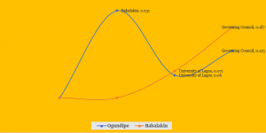 Analysis further shows that one percent of public interest in Professor Ogundipe increased information seeking about Dr Babalakin by 23.1%, while a percent interest in Dr Babalakin increased the need to seek information about the Governing Council by 18.7%. This is quite different from what we found for Professor Ogundipe. One percent interest in Professor Ogundipe only increased public’s need of seeking information about the Governing Council by 12.5% [see Exhibit 2].