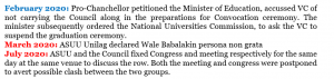 Examining the genesis of the crisis, our analyst discovered that the face-off became public knowledge in February, 2020 within the frame of what could be described as ‘early warning’ to other stakeholders [see Exhibit 1]. Further checks reveal that there were no proactive steps by the concerned stakeholders to resolve the crisis during the month. The inability to resolve the matter in February, 2020, according to our analyst led to the announcement of the University’s Pro-Chancellor, Dr Wale Babalakin as persona non-grata by Staff Unions in the University.