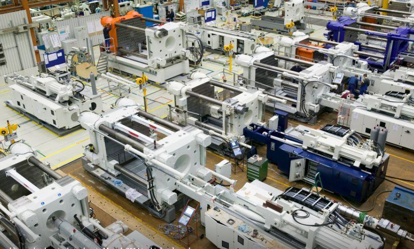 A Krauss Maffei machinery manufacturing floor with plastics machinery at various stages of preparation.