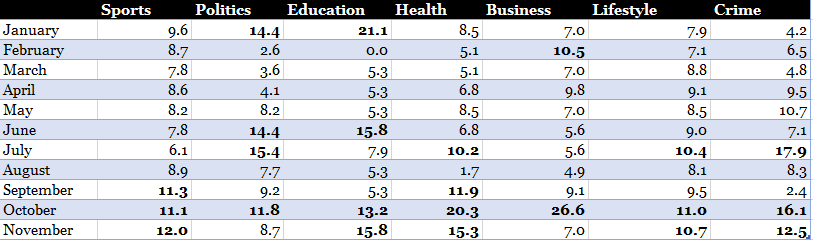 On a surprising note, consumption of happenings and events related to education and politics was high in June, six months after recording such feat. The level of consumption across news categories increased in July. Our analysis reveals that July was the month that ignited consumption of more than two news categories by Nigerian. During the month, crime, politics, lifestyle and health were searched and read the most. In August, the readers prioritised sports, crime and politics. Health and sports news were the priorities in September. In October, business, health, crime, education, politics and sports were predominantly considered by the readers. In November, education, health, crime, sports and lifestyle news were the priorities.