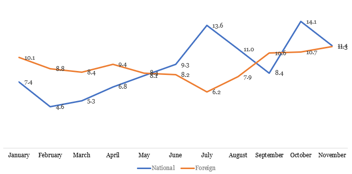 There was a moderate difference between consuming national and foreign news categories from January to April [see Exhibit 2]. In May, though Nigerians searched and read foreign news most, a closed level of consumption was discovered. A slight difference in the consumption across the two geographies also found in June before wide margin occurred in July and August. This is equally recorded in September and October. Like the closed level of consumption recorded in May, a slight difference existed in November. Though, there are 23 days to the end of 2021, our projection indicates that Nigerians and other nationals in the country would search and read foreign news content more than the national ones.