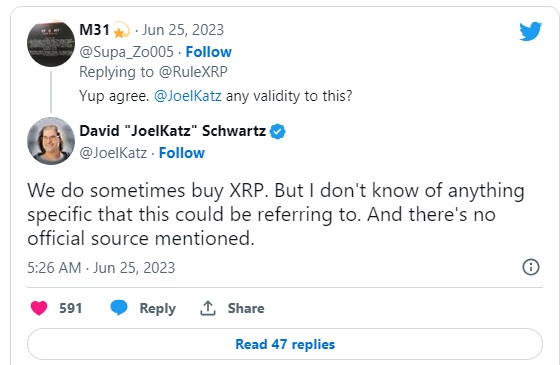 However, Ripple CTO denied the rumor publicly on Twitter stating “We do sometimes buy XRP. But I don’t know of anything specific that this could be referring to. And there’s no official source mentioned.”