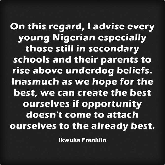 On this regard, I advise every young Nigerian especially those still in secondary schools and their parents to rise above underdog beliefs. Inasmuch as we hope for the best, we can create the best ourselves if opportunity doesn’t come to attach ourselves to the already best. Inasmuch as we want to be a LION/LIONESS, FUTOITE etc, we can create name for any higher institution we find ourselves just like the assumed World Cup underdogs went farther than expected. The lecturers of some believed low ranking institutions were students of these universities at least.