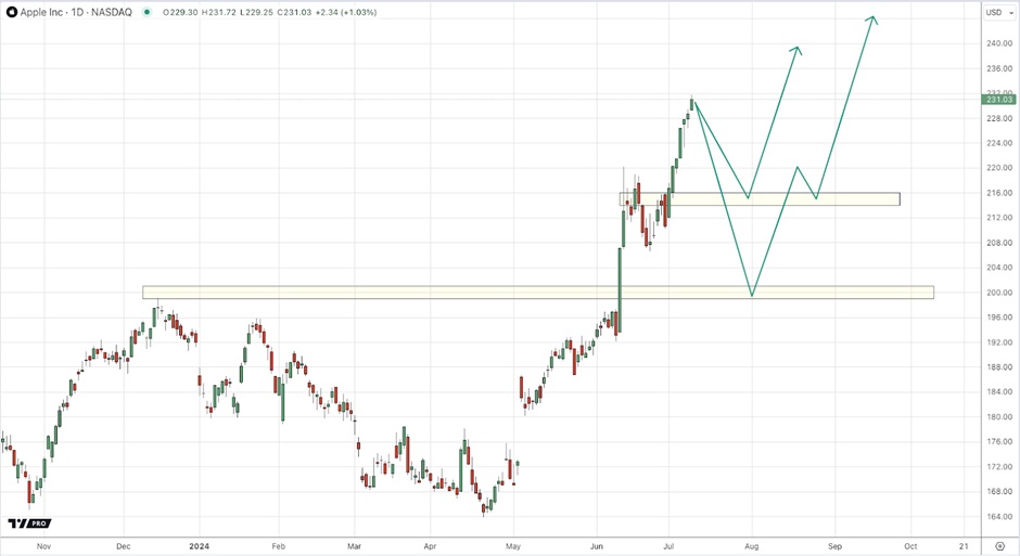 The increase in shipments is already impacting Apple’s stock value, and continued growth could further boost the company’s shares. However, it’s important to consider factors such as market competition and the overall economic situation. Currently, the company’s shares are at a historic high, and future movements will likely focus on maintaining value. This creates opportunities for transactions at support levels like $215, followed by the historical resistance level, now support, at $200. Automated trading functions have a wide range of applications in these scenarios.