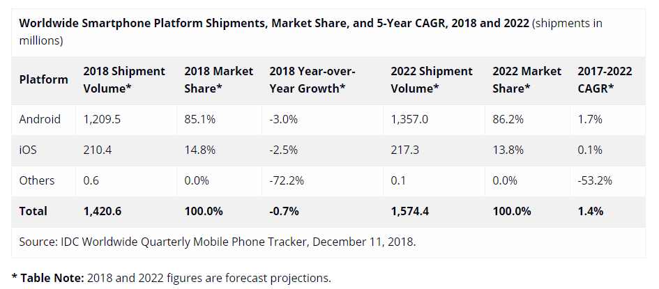 iOS: iOS smartphones are forecast to drop by 2.5% in 2018 to 210.4 million. The launch of expensive and bigger screen iOS smartphones in Q3 2018 helped Apple to raise its ASP, simultaneously making it somewhat difficult to increase shipments in the current market slump. IDC is forecasting iPhone shipments to grow at a five-year CAGR of 0.1%, reaching volumes of 217.3 million in 2022. Despite the challenges, there is no ambiguity that Apple will continue to lead the global premium market segment.