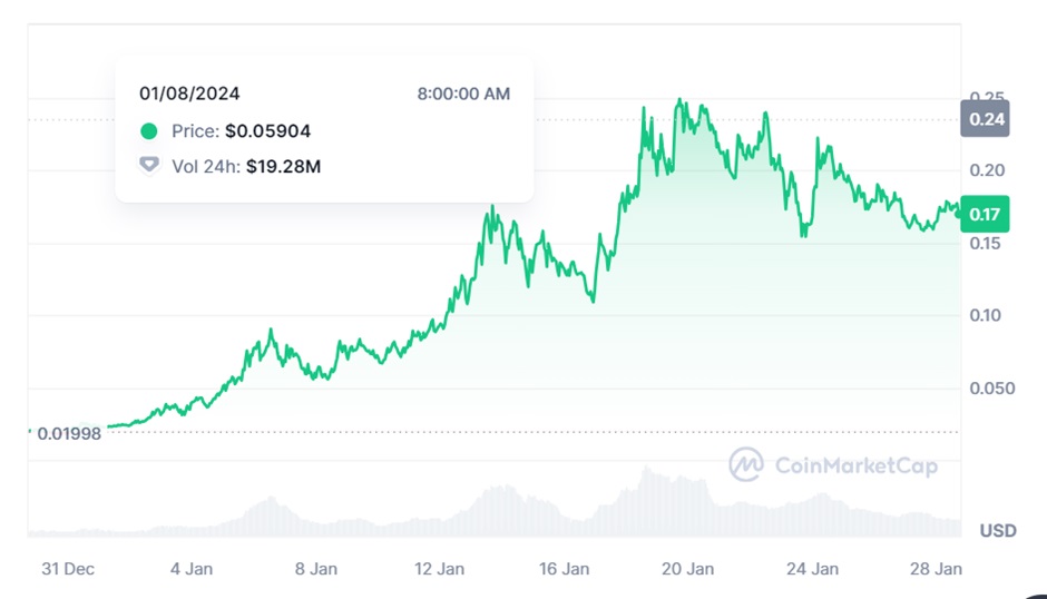 The Solana-based meme coin, Myro (MYRO), has recently witnessed a 763% surge in market value in January alone. This remarkable increase is primarily driven by a blend of factors: