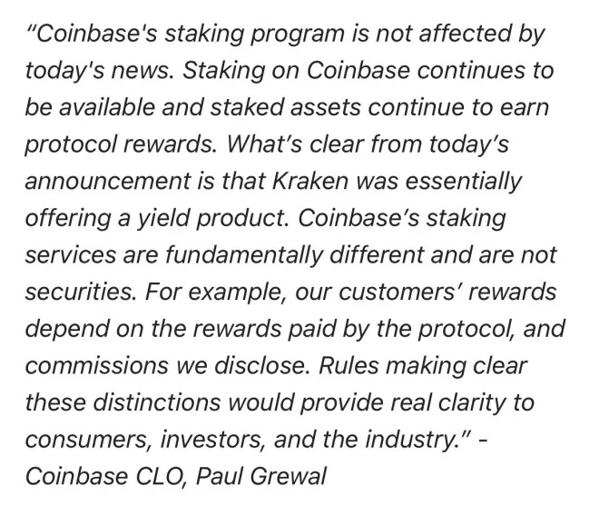 Coinbase says Kraken news will not affect their staking program, Coinbase CLO, Paul Grewal said they’re willing to fight SEC on this issue.