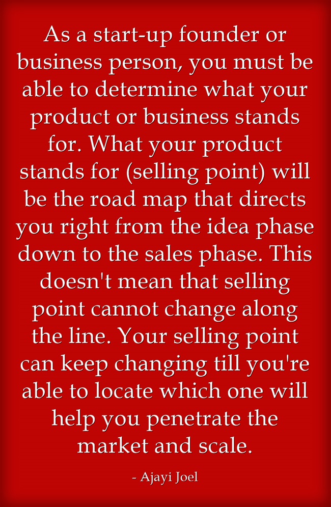As a start-up founder or business person, you must be able to determine what your product or business stands for. What your product stands for (selling point) will be the road map that directs you right from the idea phase down to the sales phase. This doesn’t mean that selling point cannot change along the line. Your selling point can keep changing till you’re able to locate which one will help you penetrate the market and scale.
