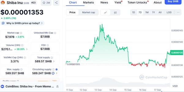 Shiba Inu (SHIB) has shown steady movement over the past week. The token trades at $0.00001353, up 2.89% in seven days. Market data shows a capitalization of $7.97 billion, with 589.24 trillion SHIB already circulating out of its maximum supply. SHIB peaked at nearly $0.0000145 in the second week of September before retreating. It then settled between $0.0000131 and $0.0000133 and then rose to $0.0000135. The $0.0000130 level remains strong support, while $0.0000145 acts as key resistance.