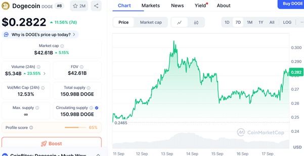 Dogecoin (DOGE) also posted strong gains this week. It is trading at $0.2822, marking an 11.56% rise over seven days. The token reached a peak above $0.30 on September 13 before falling back to a low near $0.26. Buyers later stepped in, driving the price above $0.28 again.