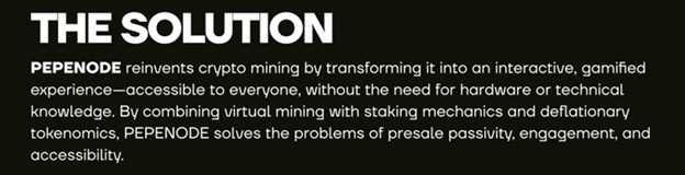 PEPENODE focuses mainly on that gamified mining experience. Virtual miner nodes simulate the mining process and generate rewards based on how much users participate and upgrade their setups. Future plans include adding more meme coin rewards and NFT features.