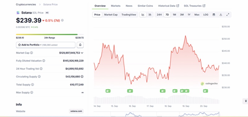 Recent Solana (SOL) performance shows the token holding around $239, with trading volumes averaging $1.5 billion per day and a market cap above $70 billion. While SOL remains a dominant layer-1 asset, recurring network slowdowns have created caution among users. Price charts show resistance near $160 and support near $150, leaving traders wondering if the token can break through or if it faces another short pullback.